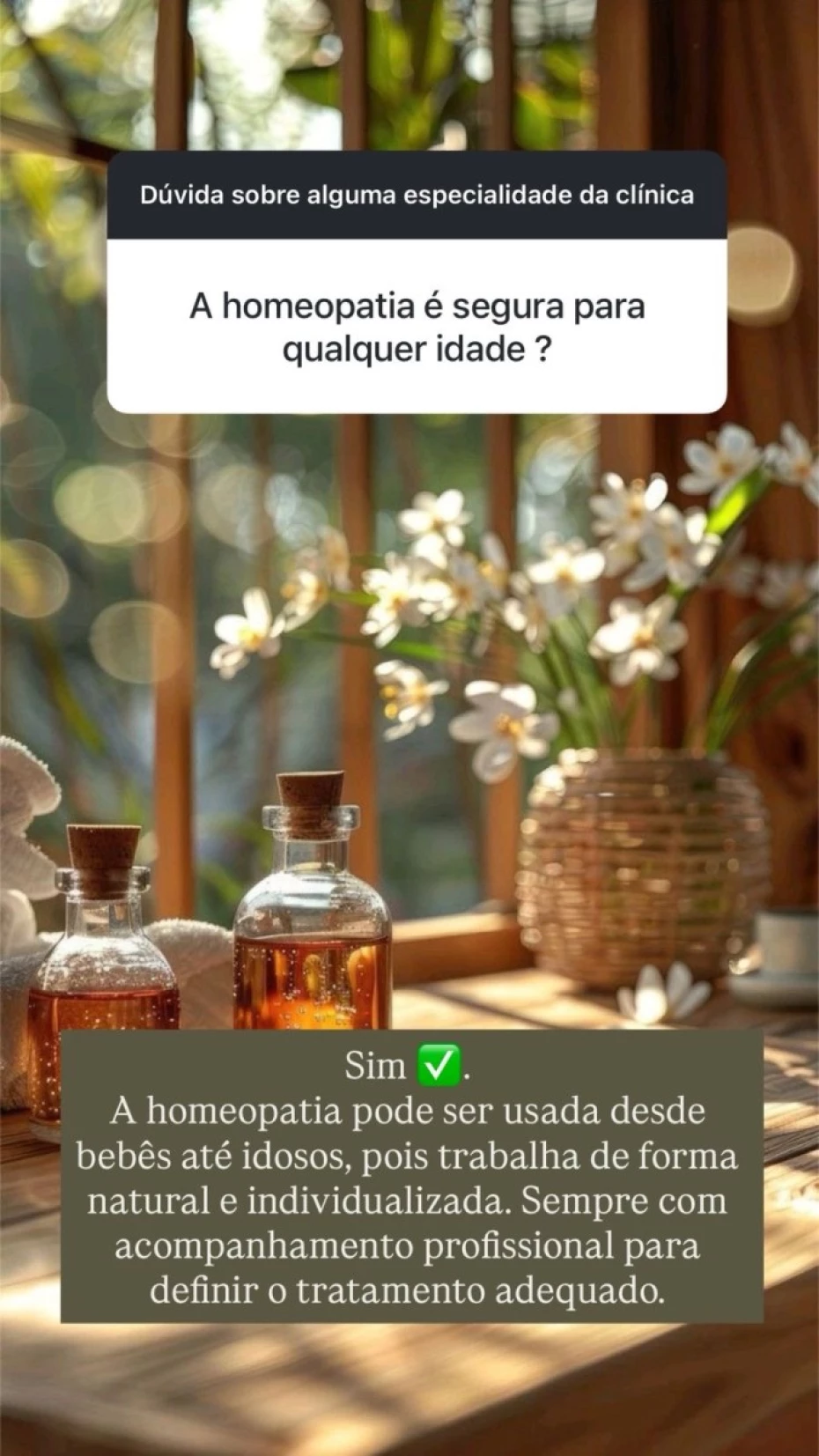 - Homeopatia: Tratamentos individualizados que buscam o equilíbrio do organismo.